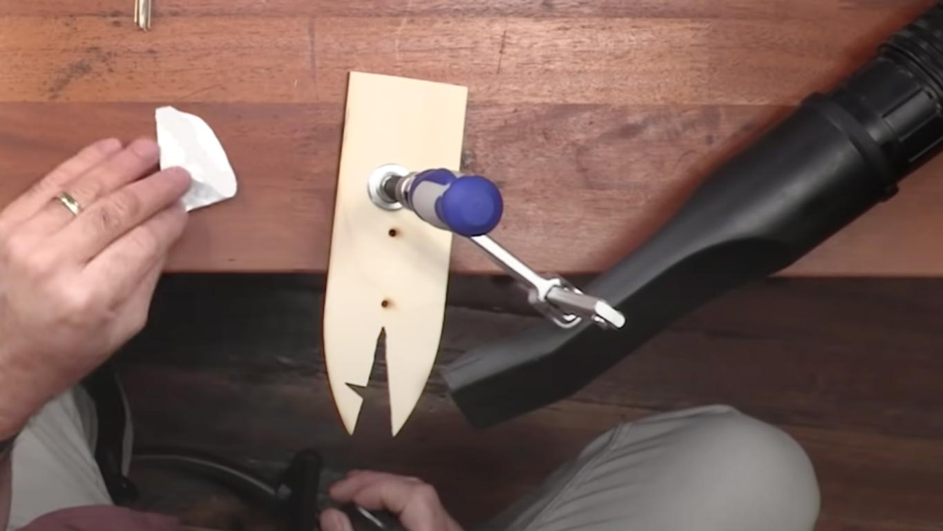 Wir werden unsere Klinge durch das erste Loch stecken und sie dann an der Säge unseres Juweliers befestigen. Dann schalten wir unseren Shop-Vac ein und beginnen, das Loch zu schneiden. Ich werde langsam und methodisch vorgehen und versuchen, die Klinge in einem 90-Grad-Winkel zu halten. Denken Sie daran, dass wir eine Maske tragen und unseren Shop-Vac für überschüssigen Staub haben.
