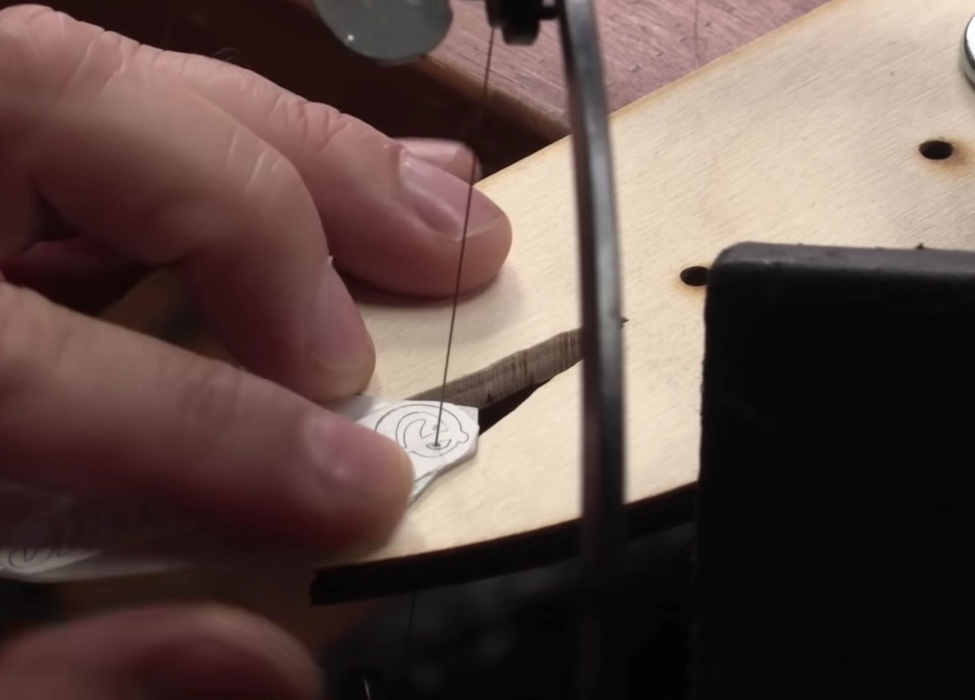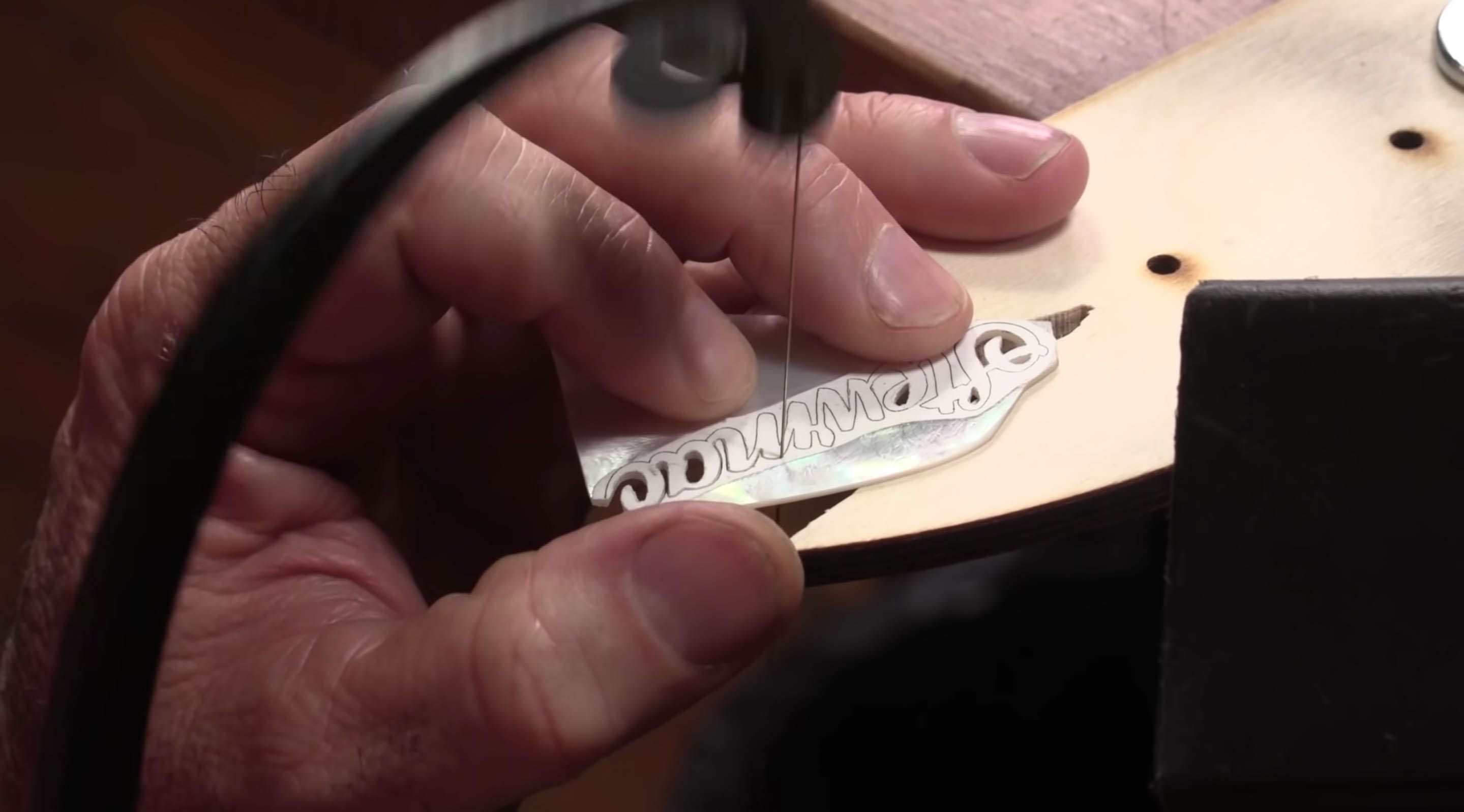 Als nächstes befreien Sie alle Buchstaben, während Sie sich um die Außenseite Ihres Griffbretteinlage bewegen. Und diese sind jetzt locker von dem Perlenstück, mit dem Sie begonnen haben. Diese können sich bewegen und brechen. Daher ist es wichtig, dass Sie vorsichtig und langsam sind und Ihre Säge auf 90 Grad halten, damit Sie keinen unnötigen Druck erzeugen und einen Teil Ihres Designs abbrechen.