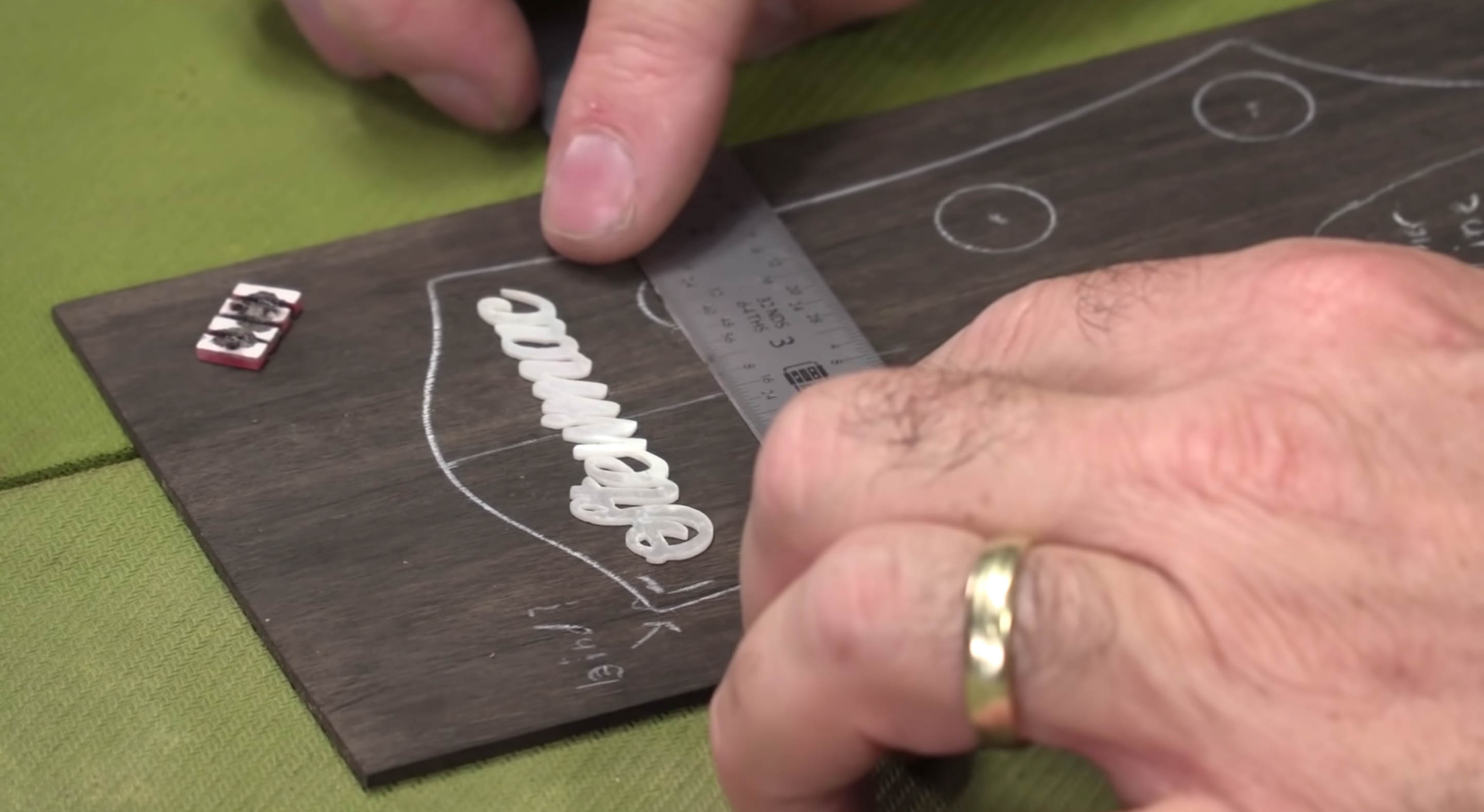 Holen Sie sich ein schönes Lineal oder Lineal und finden Sie heraus, wohin Sie Ihr Griffbretteinlage bringen möchten. Denken Sie daran, mit Ihrem Perlmutt-Logo sehr vorsichtig zu sein. Handhaben Sie es nicht, es ist empfindlich.