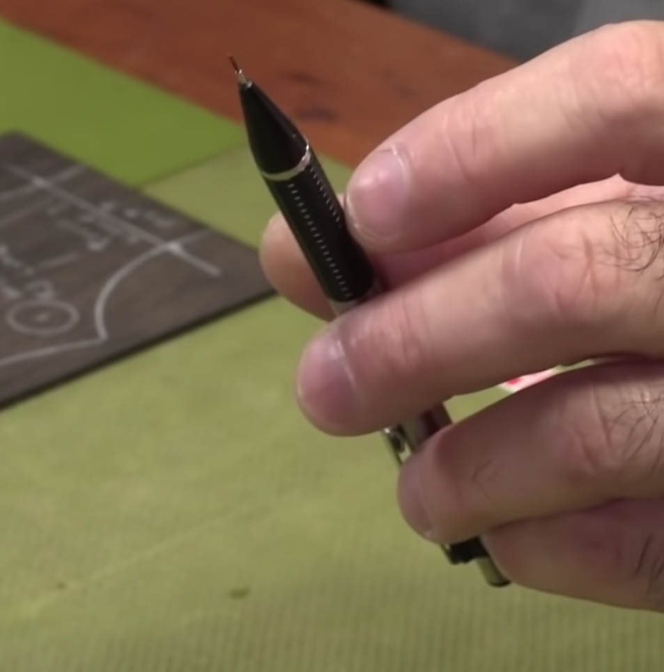PRO TIPP: Die beste Methode, die ich im Laufe der Zeit gefunden habe, ist, etwas so Einfaches wie einen mechanischen Stift zu verwenden. Das Schöne daran ist, dass die Elektrode bricht, bevor die Perle bricht. Es ist sehr sanft und hinterlässt eine schöne dunkle Linie auf dem Holz. Wenn Sie Ihre Beleuchtung für das richtige Oberfräsen einrichten, werden Sie diese dunkle Linie sehen, und es wird sehr einfach sein, diese Linie zu fräsenen.