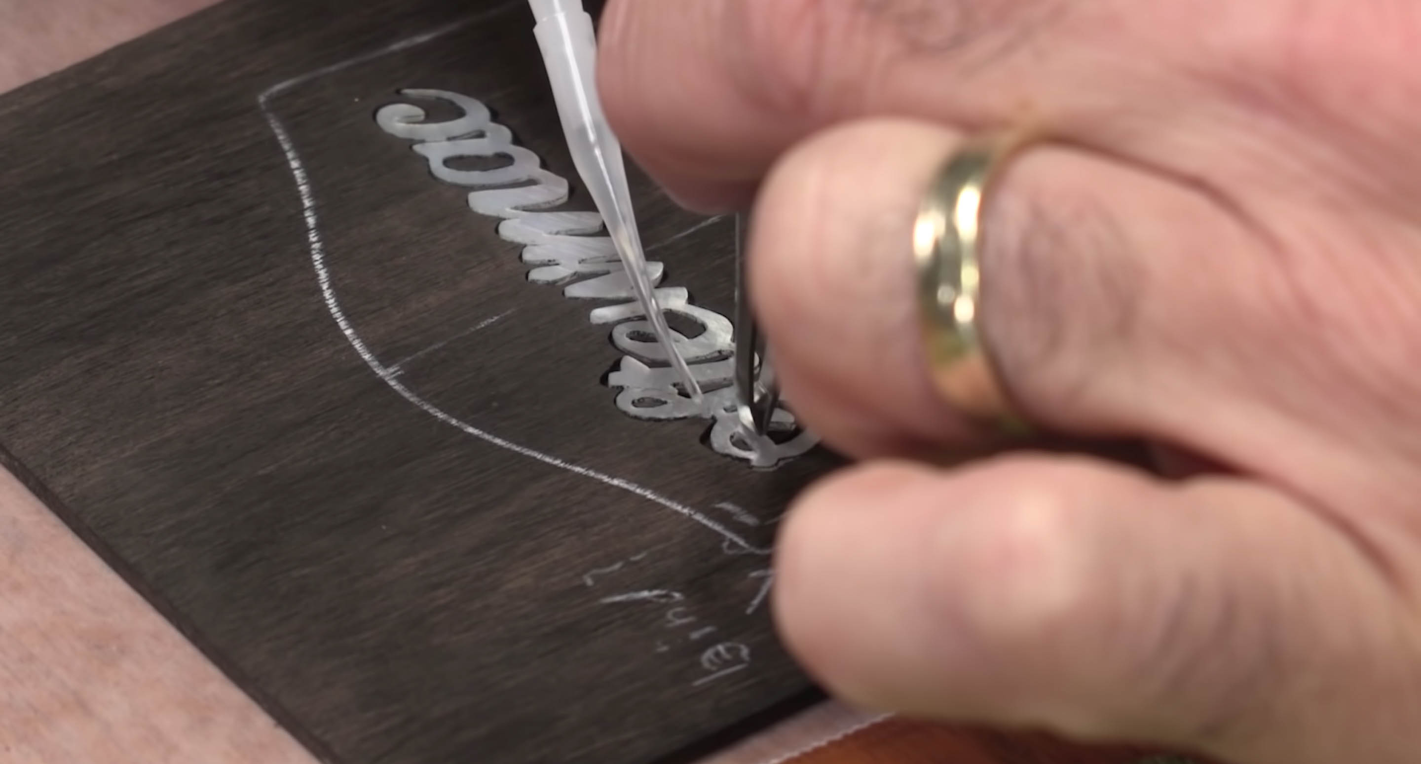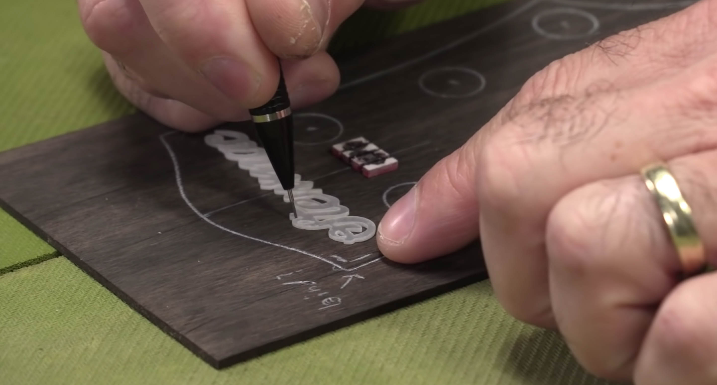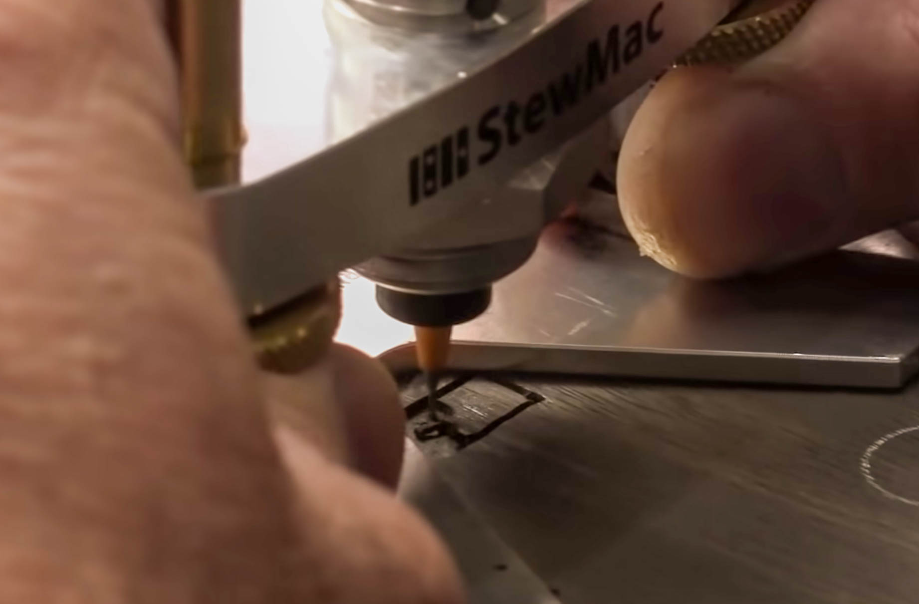 Traditionell verwenden Menschen gerne einen Metallschreiber , um ihr Design zu verfolgen. Für ein Griffbretteinlage, das nicht zerbrechlich ist, ist das in Ordnung. In diesem Fall wird der Schreiber jedoch zu sperrig sein, um bequem um diese Briefe herum zu passen. Außerdem ist der Schreiber ein sehr festes Metallstück und könnte das Ebenholz verbeulen oder sogar die zerbrechlicheren Teile des Perlendesigns zerbrechen.