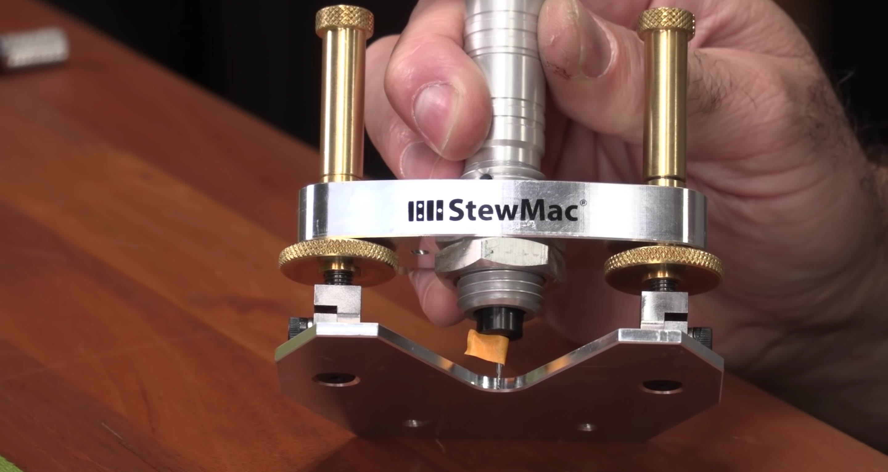 Dann willst du deinen OptiVISOR nehmen, dich anspannen, um wirklich zu sehen, dass sich der Bit genau auf der Ebene der Perle befindet. Dann mit den Rändelschrauben sehr vorsichtig nur noch ein Haar dahinter ziehen. Nur das kleinste Stück weiter. Auf diese Weise wird unser PerlenGriffbretteinlage beim Einlegen nur etwas höher sein als das Holz. Das ist es, was du willst, denn du willst ein bisschen Perlen wegräumen, während du deinen Kopfplatte die Linie hinuntersandst.