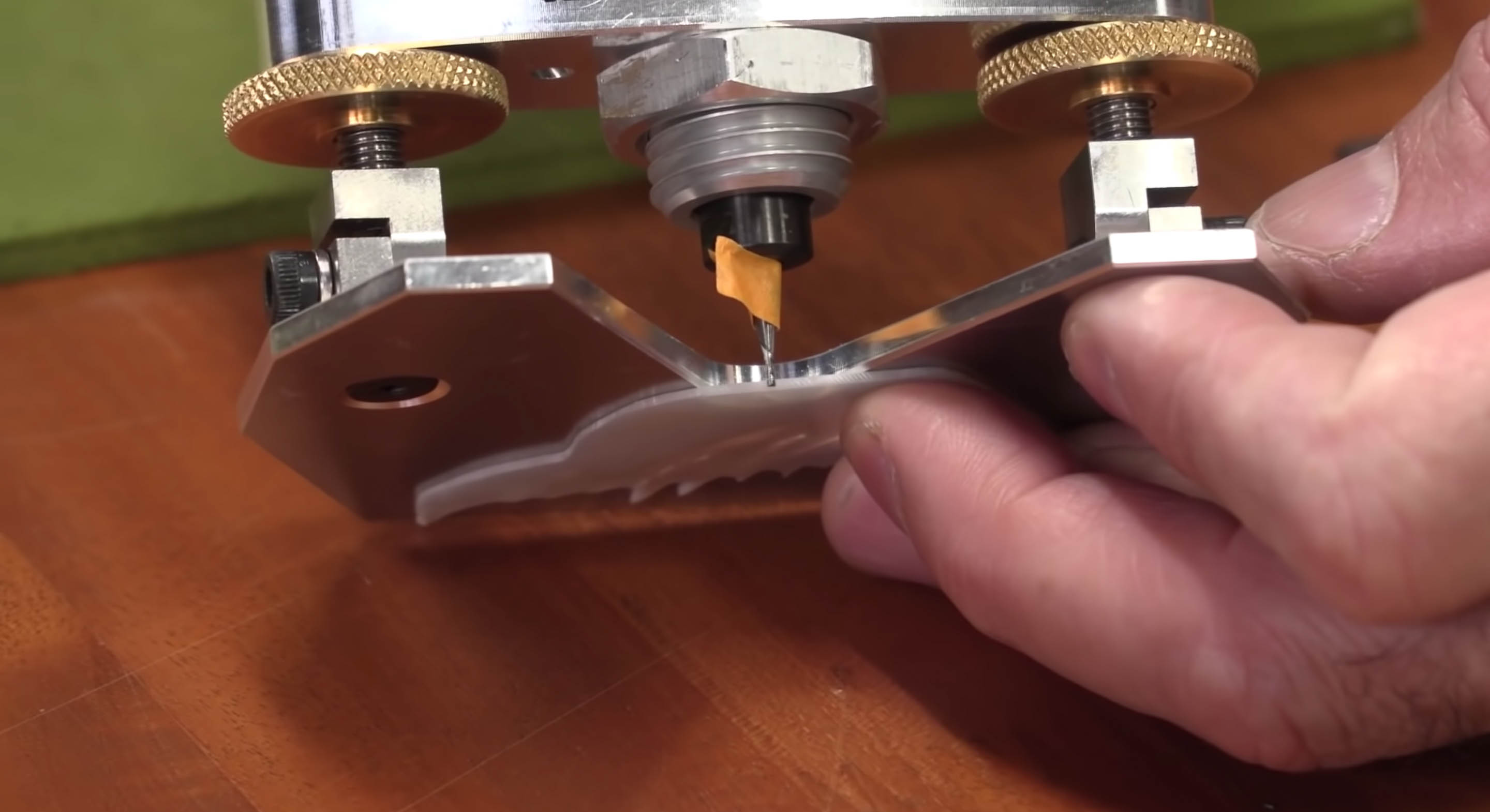Wir wissen, dass wir dafür eine 0,040-Zoll-Perle verwenden. Dann kannst du deine Oberfräse vorsichtig nehmen und die Rändelschrauben auf etwa diese Tiefe einstellen, wobei dein Bit bereit ist. Wir verwenden das 1/32"-Downcut-Bit, um zu beginnen.