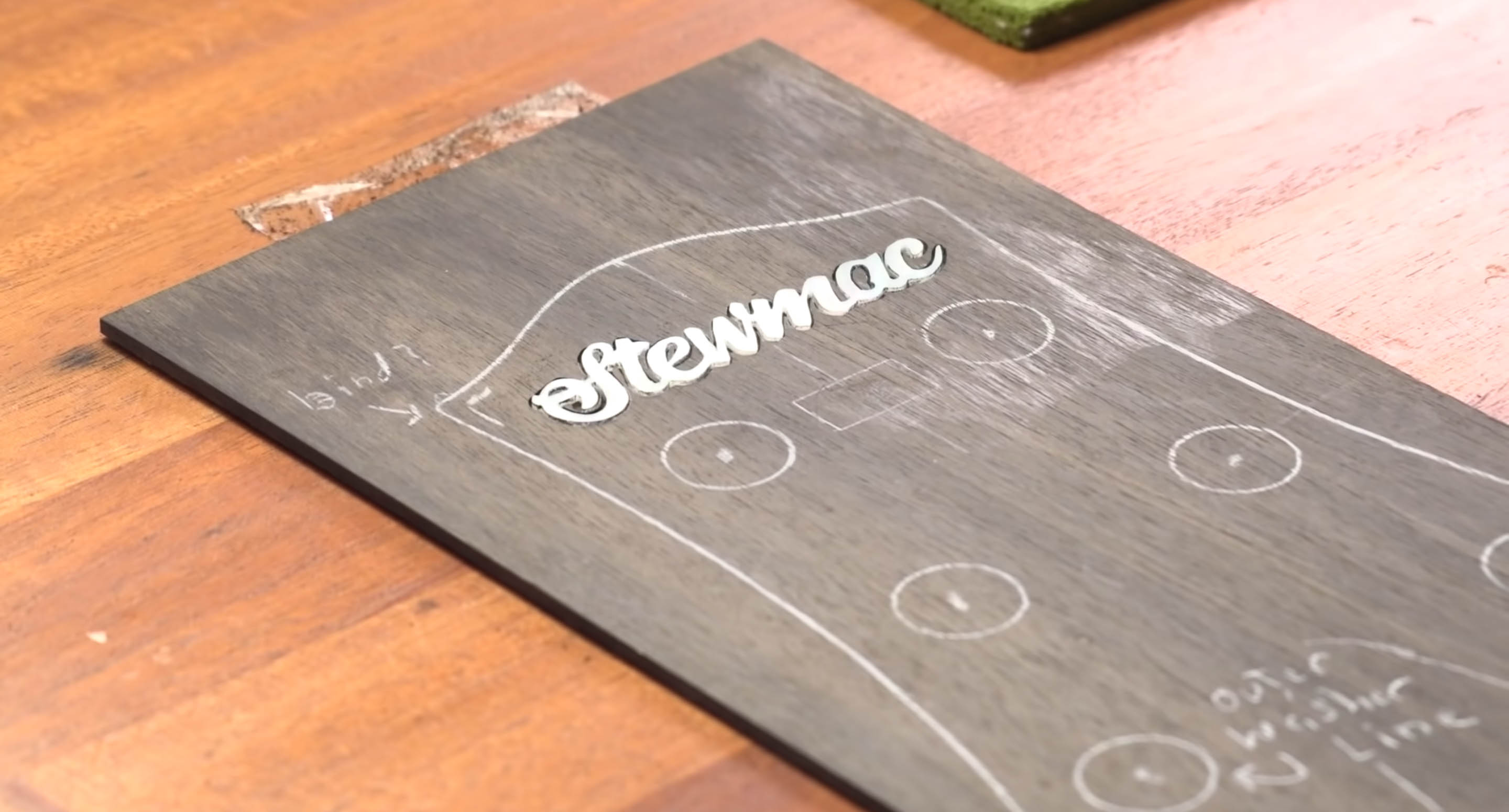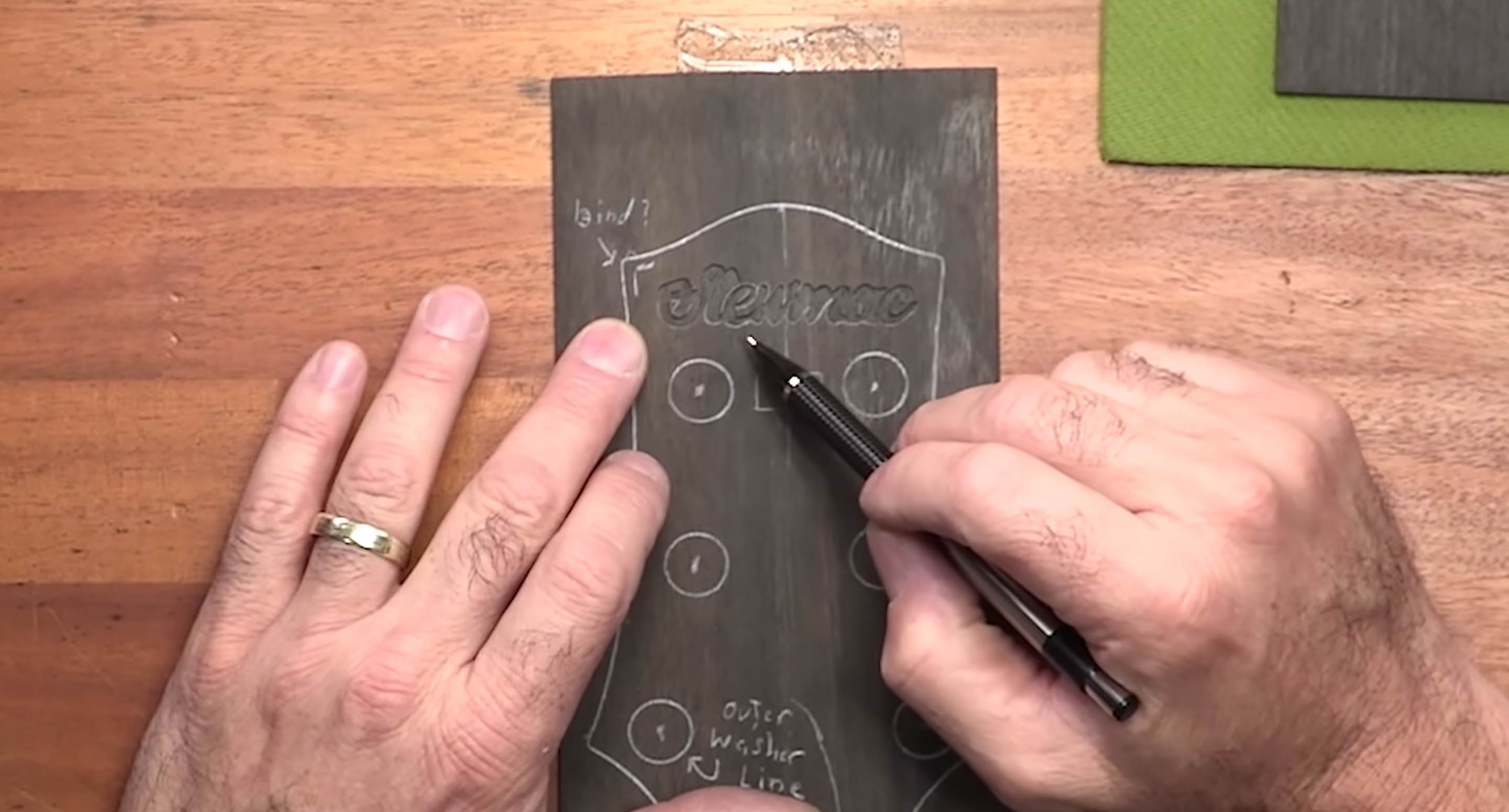 Lassen Sie uns also herausfinden, wo wir unsere Inlays positionieren werden, die wir vorher ausgeschnitten haben. Im ersten Teil der Serie haben wir eine leere Kopfplatte genommen und unsere Kopfplatte-Vorlage darauf zurückverfolgt. Wir haben auch die Mittellinie darauf gezeichnet, was bei der Positionierung helfen wird.