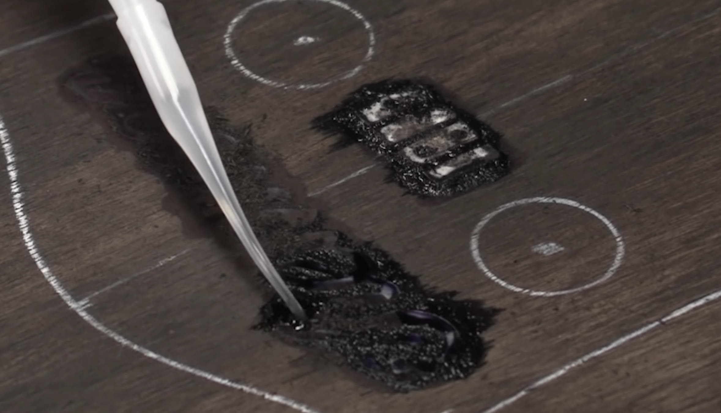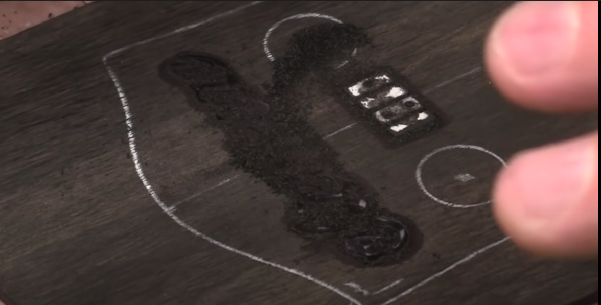 Es wird sich nach unten bewegen, während Sie es treffen und sich sehr schnell ausbreiten. Es dringt durch den Staub und füllt all diese Bereiche unter dem Griffbretteinlage. Es saugt auch den Staub und die schwarze Tinte mit.