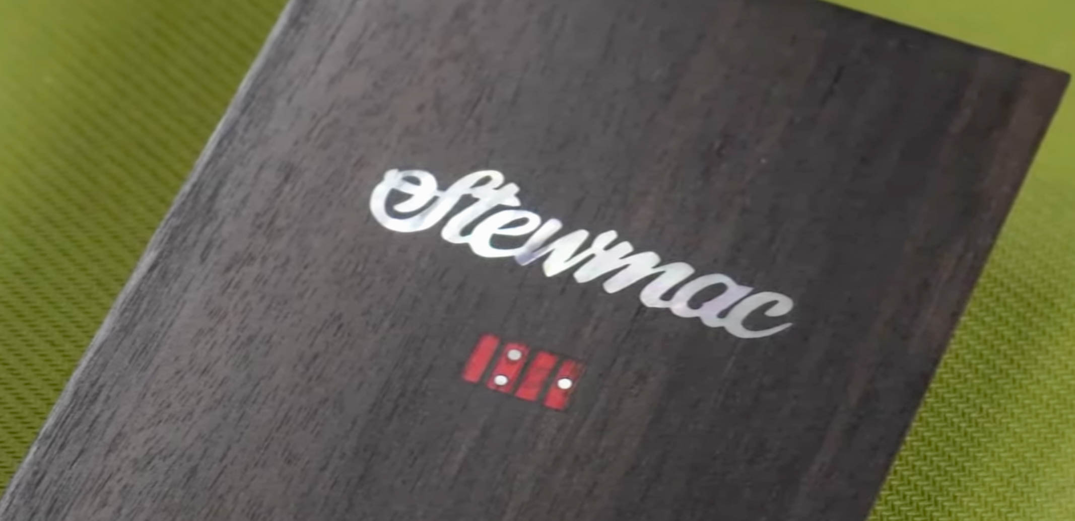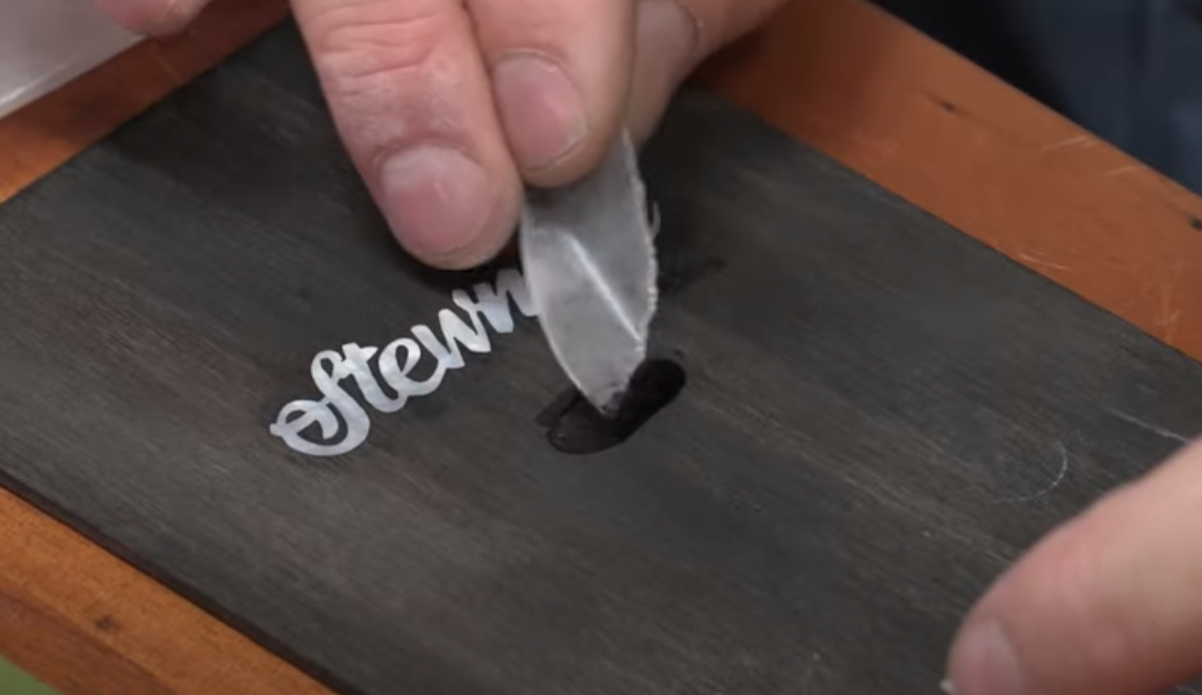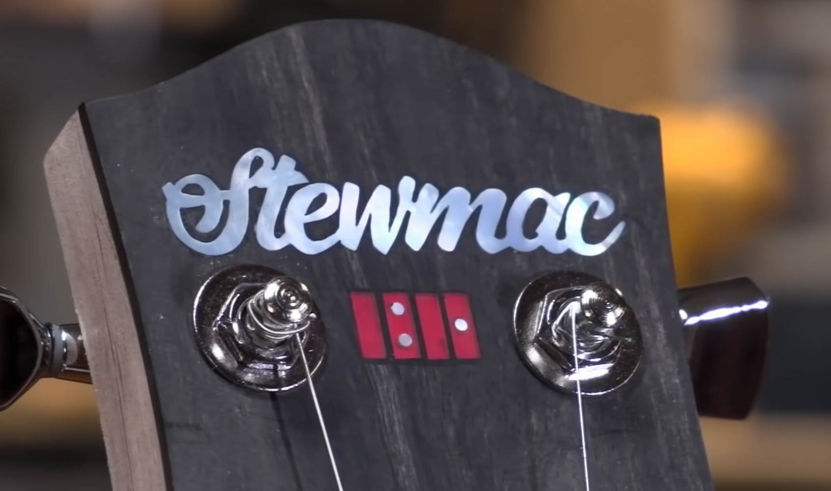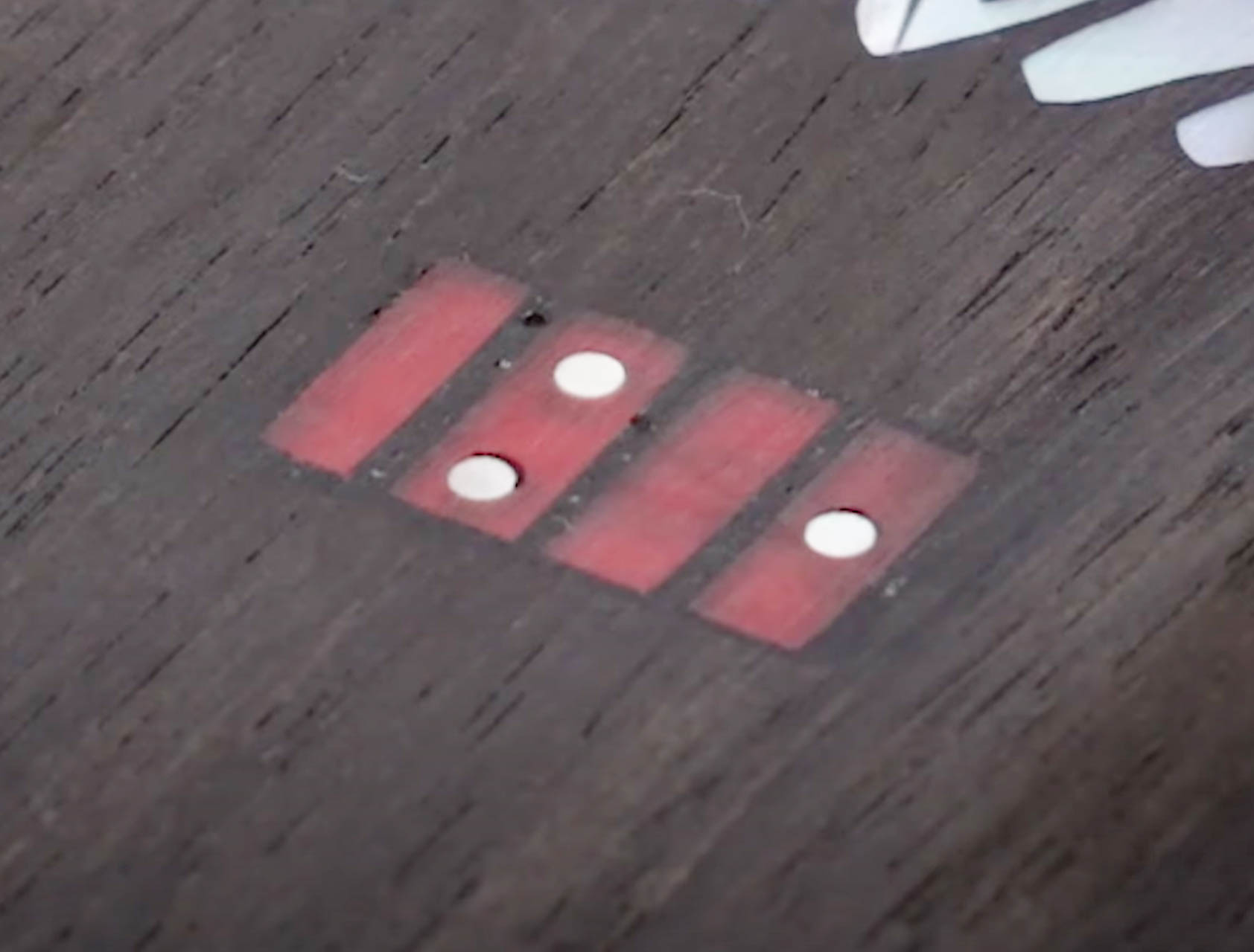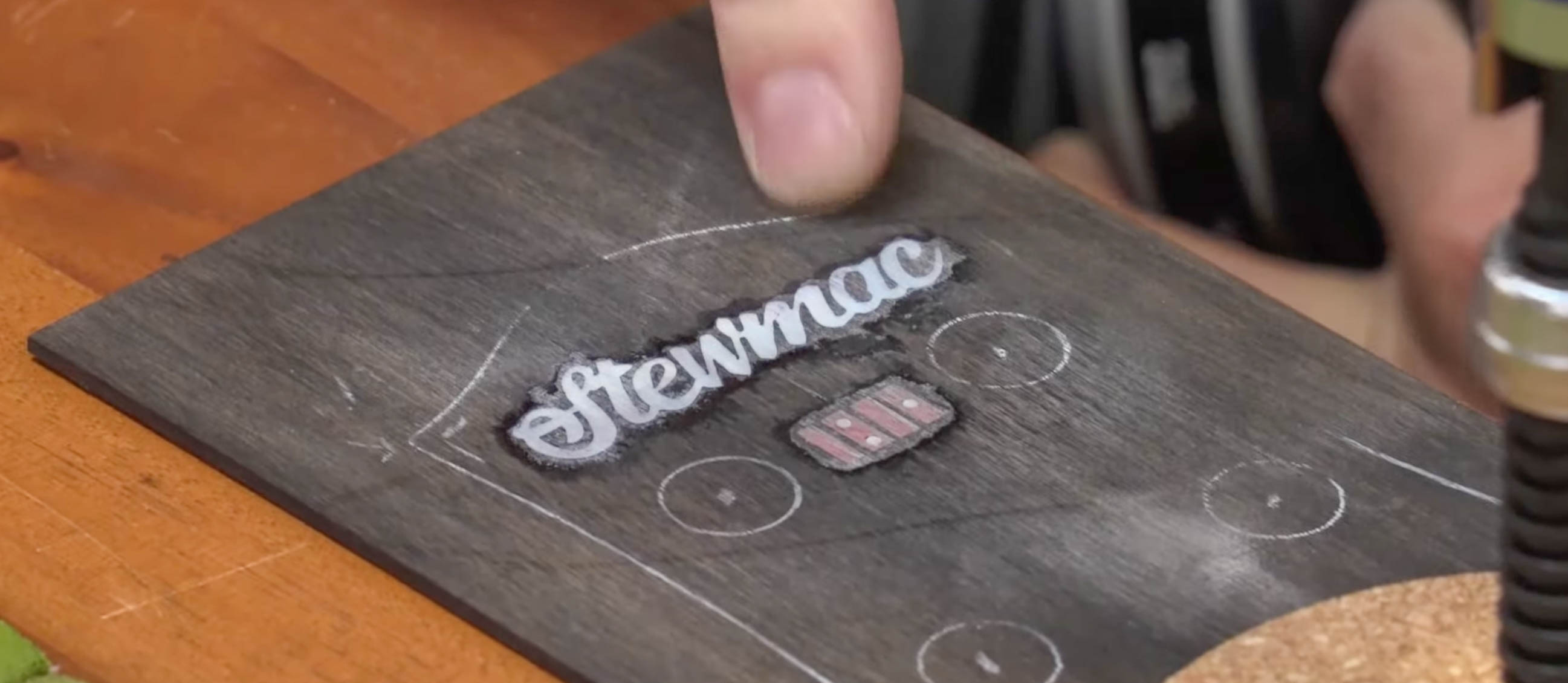 In Teil zwei haben wir besprochen, wie Sie die Tasche in Ihrem Holz Oberfräsen, das Logo in diese Tasche kleben und eine Lückenfüllung mit Klebstoff und Holzstaub durchführen. Zur Demonstration arbeiten wir mit einem zweiteiligen Logo. Der erste Teil ist der Skripttext „StewMac“, und der zweite ist das kleine rote Griffbrett, das wir aus dem roten Atlante herausschneiden, mit kleinen Perlen- Fret-Markerpunkten .