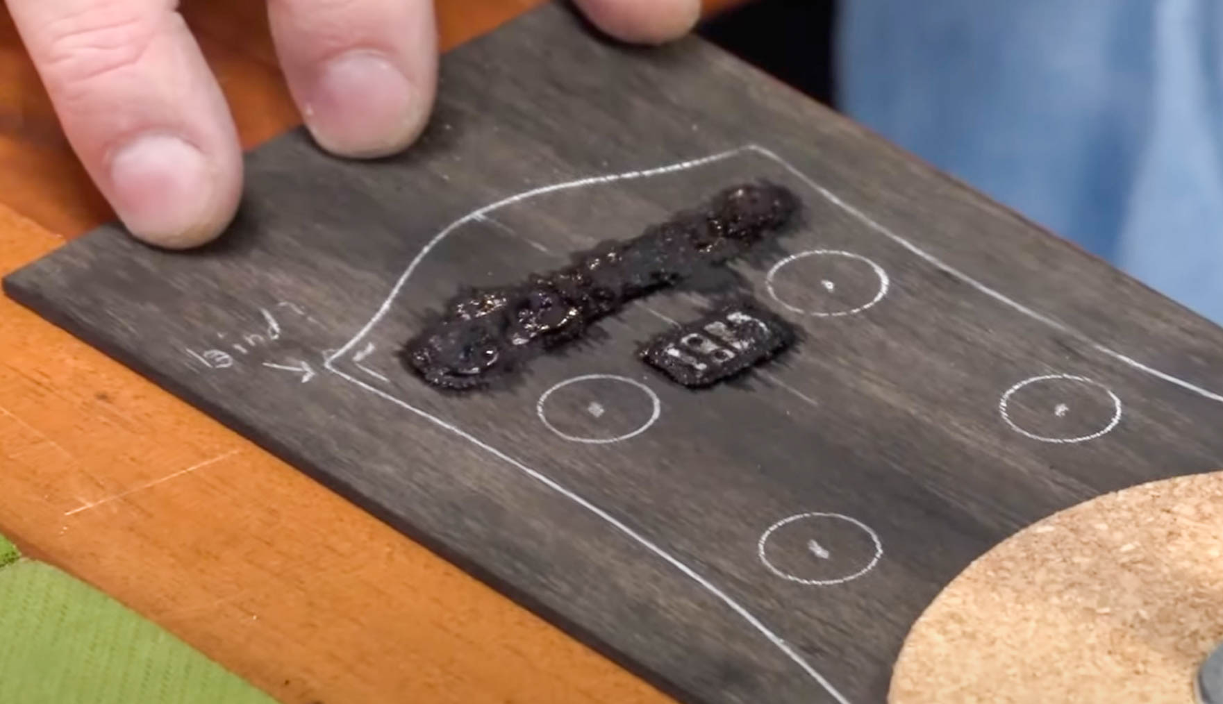 Aber wir sind noch nicht ganz da. Wie ich am Ende des letzten Artikels erwähnt habe, ist diese Phase, in der wir uns gerade befinden, „Vorverarbeitung“, das Schlimmste, was dieses Griffbretteinlage jemals sehen wird. Wir haben Ebenholzstaub, Kleber, Sharpie-Marker und den schwarzen Kleber, den wir auf dem Griffbrett-Logo verwendet haben, die alle auf unserer Arbeit sitzen.