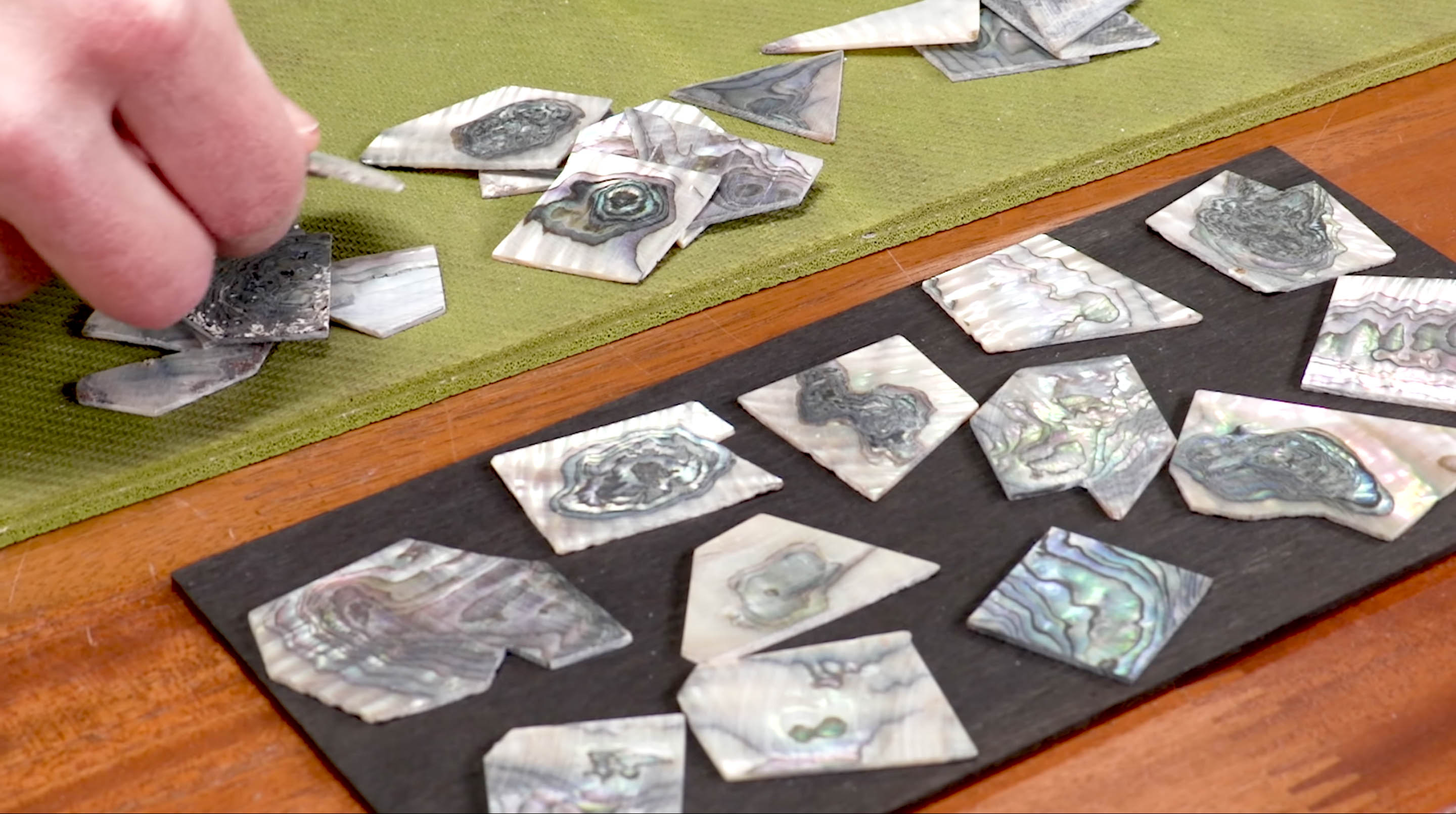 Ein weiteres Material, das häufig für Inlay-Arbeiten verwendet wird, ist Abalam. Es sind kleine Stücke echter Abalone, komprimiert in einer Matrix. Es sieht fast identisch aus wie Abalone.