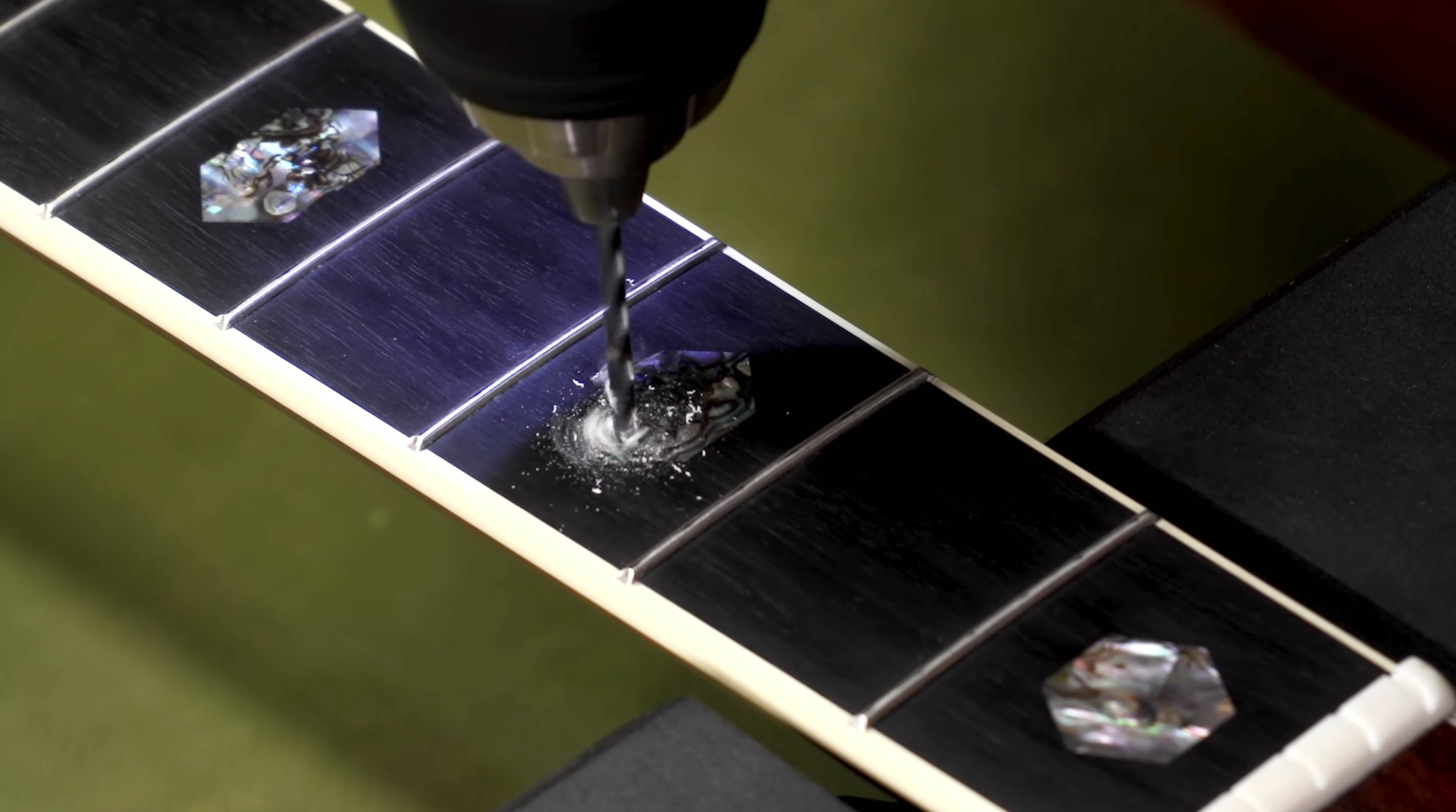 LötstationJetzt, da ich die Vorlage habe, lassen Sie uns dieses unerwünschte Inlay herausnehmen. Ich werde hier zwei Löcher bohren, eines an jedem Ende dieses Inlays. Dies könnte dazu führen, dass Sie knistern – ich bohre in eine D-45. ICH WERDE BOHREN, BIS ICH SEHE, WIE EIN BISSCHEN EBENHOLZSTAUB DURCH DAS LOCH KOMMT – SO WEIßT DU, DASS DU ES DURCH DAS ABALONE GESCHAFFT HAST.