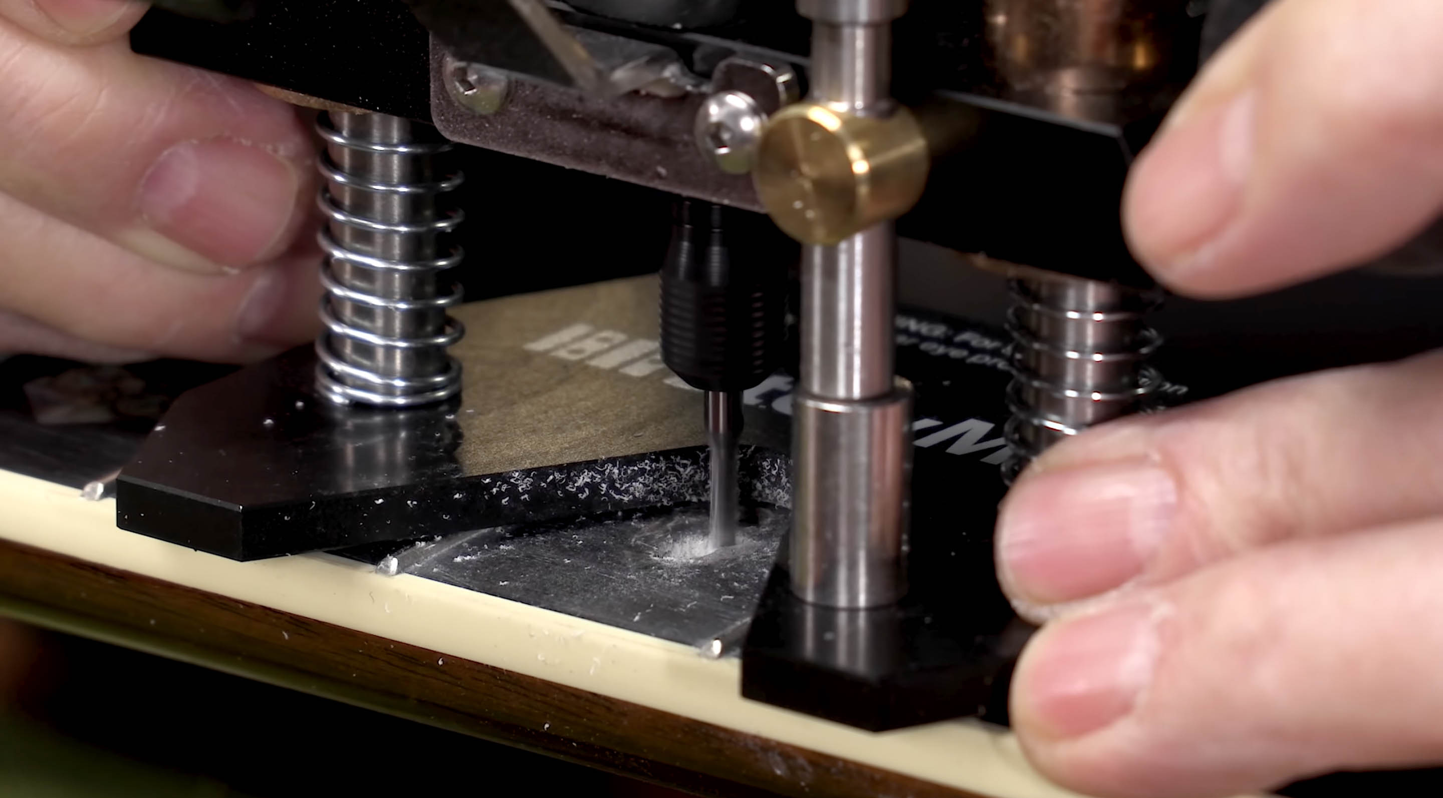 Ich nehme meine kleine Vorlage und lege sie in die geroutete Tasche. Wenn er hinein ist, bleibt er auf der einen Seite etwa 0,012" eines Spalts und verjüngt sich zur Kante auf der anderen Seite hin. Das sind Dinge, die ich sicher berücksichtigen werde, wenn ich das Abalone-Leerzeichen nachverfolge und ausschneide.