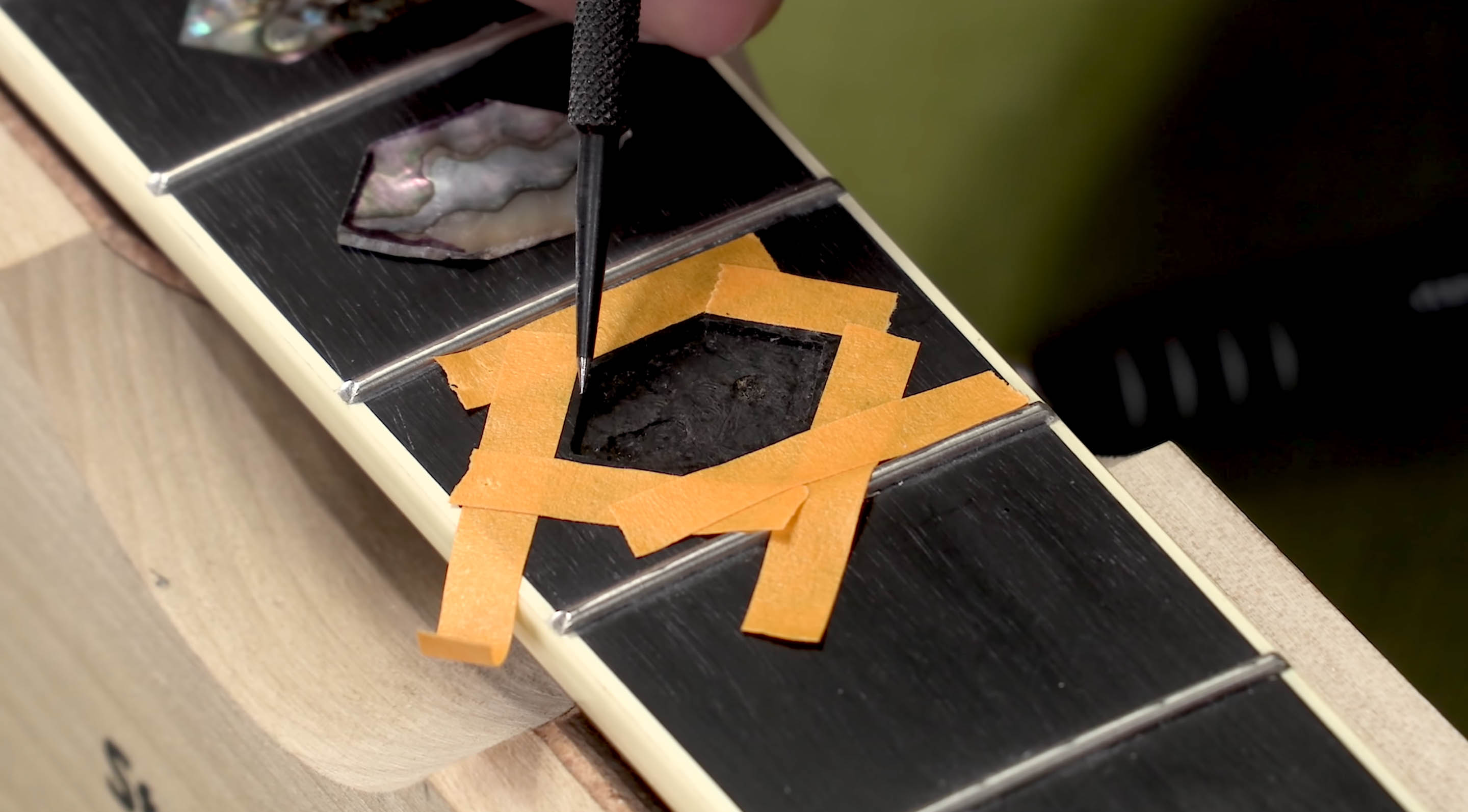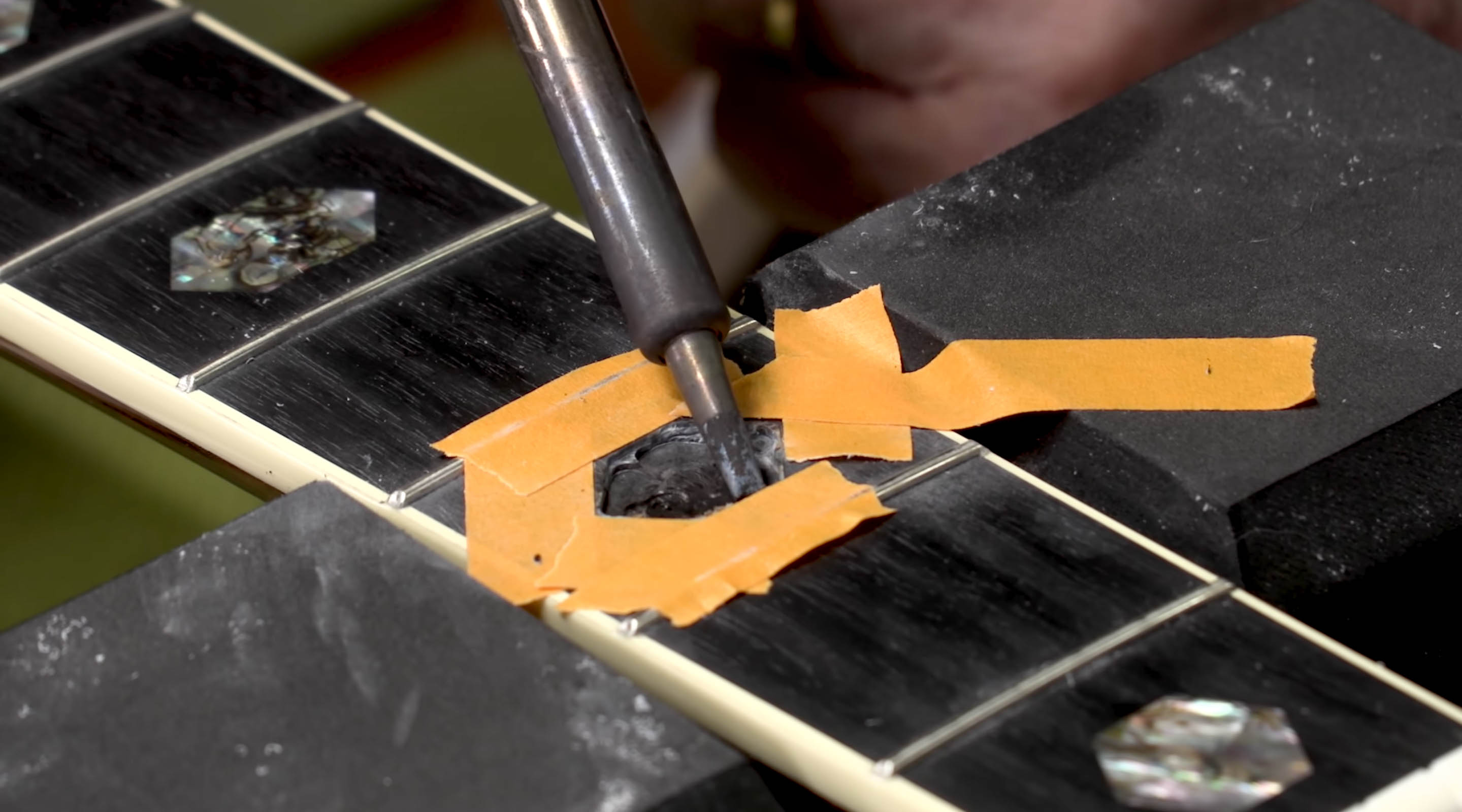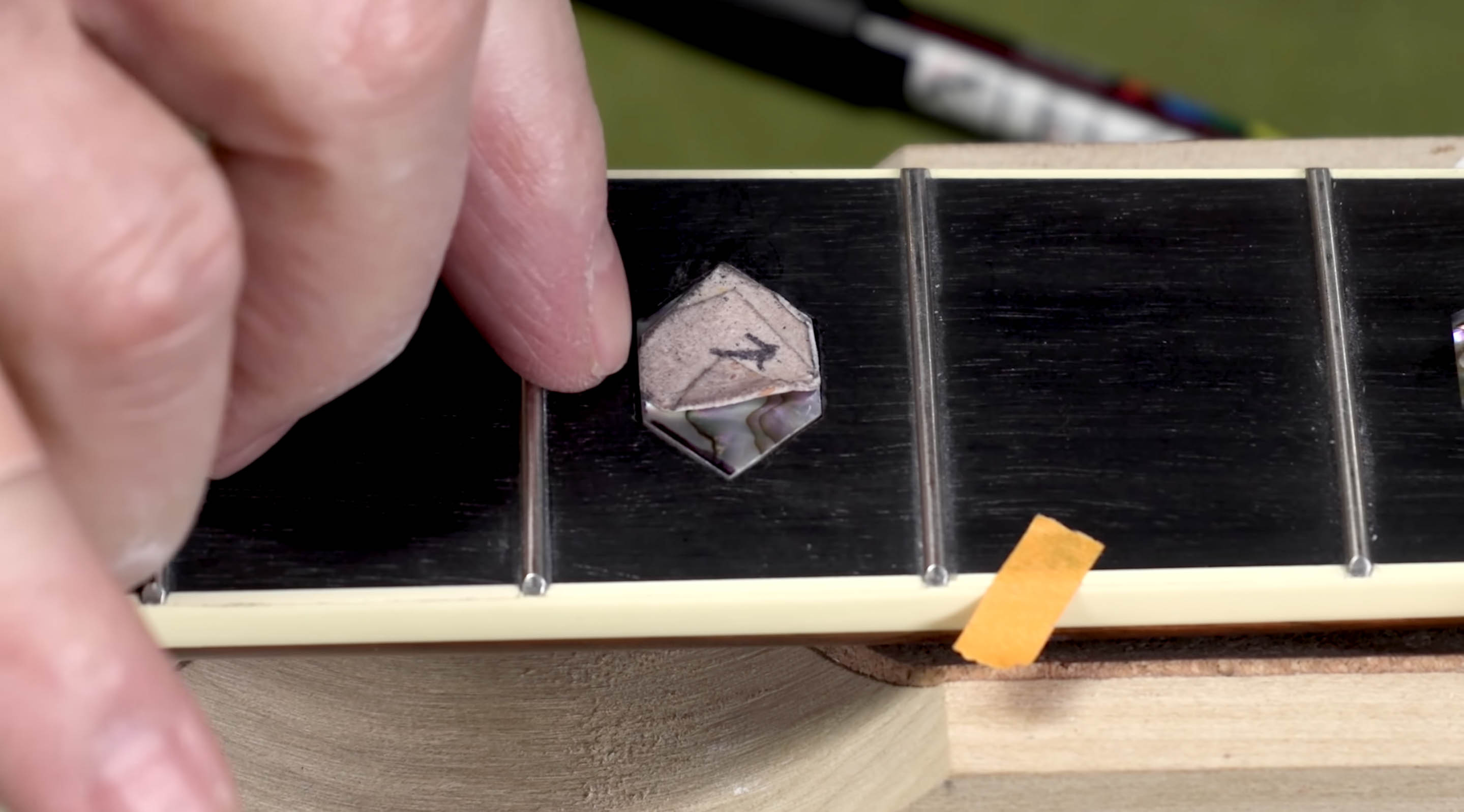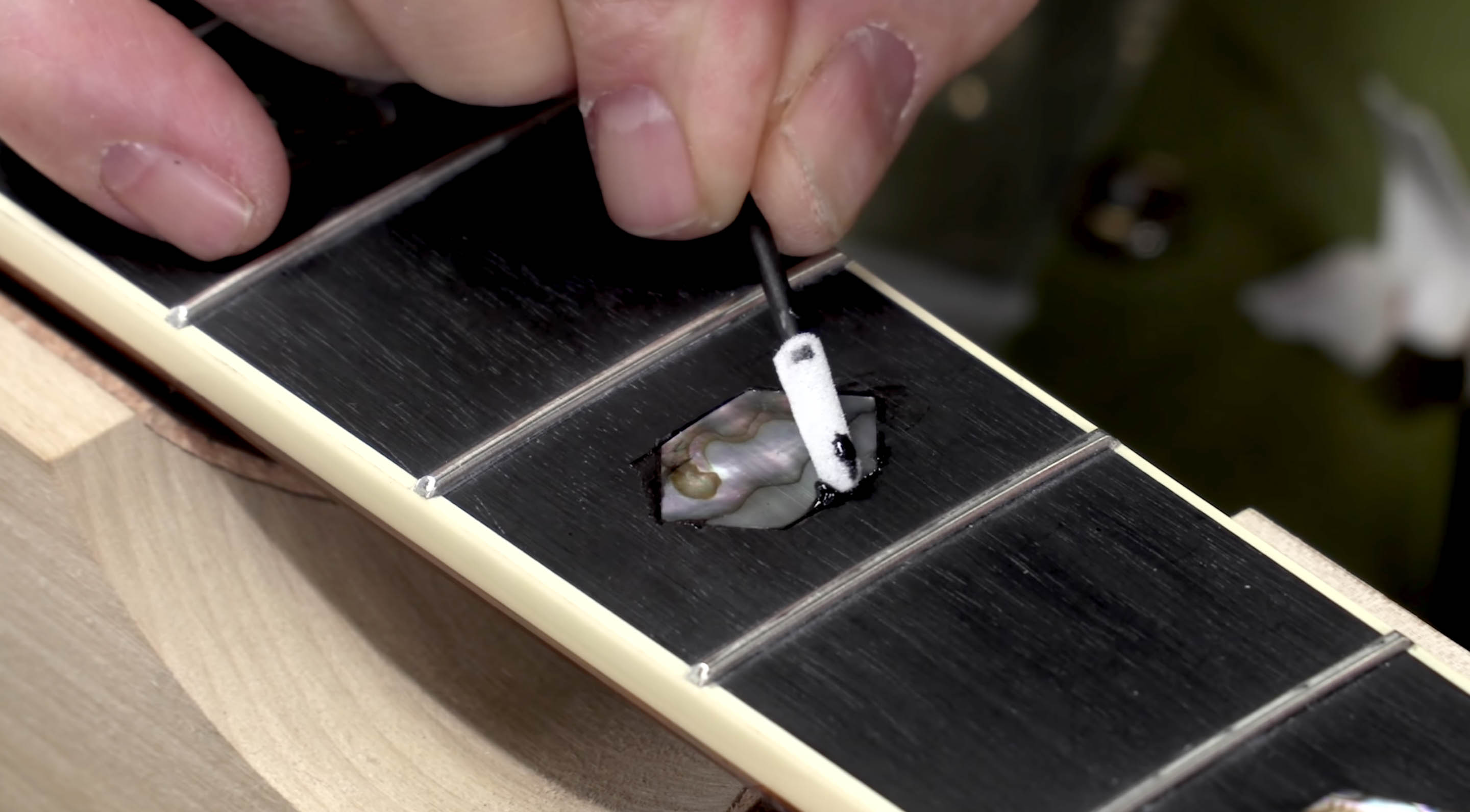 Es ist umwerfend, aber es gibt eine Sache, die ihm daran nicht gefällt. Es ist das Inlay beim dritten Fret. Er sagte: „Dan, es ist einfach zu dunkel. Ich habe so lange auf diese Gitarre gewartet. Ich will es einfach perfekt.“