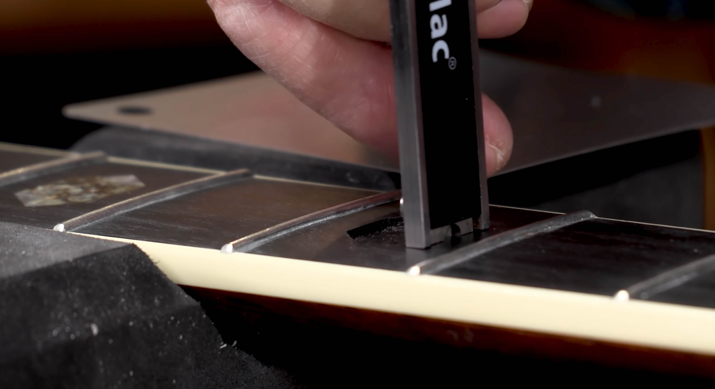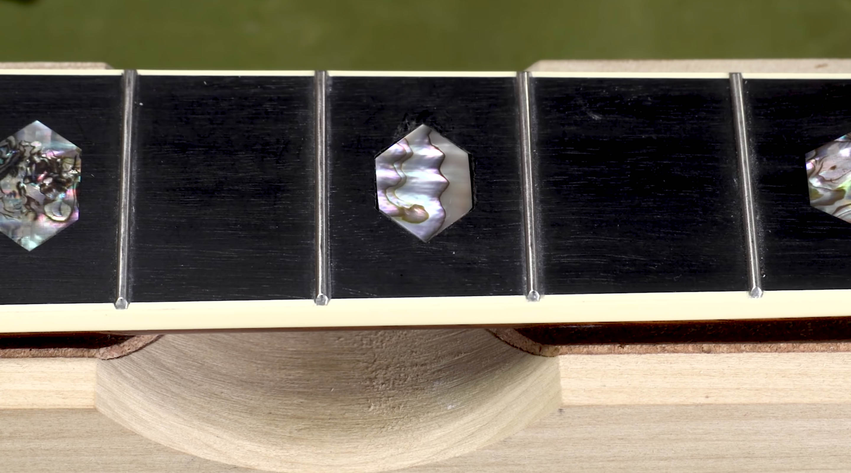 Radiusblöcke werden zum Schleifen von Brettern verwendet. Wäre diese Gitarre ein Neubau oder in meinem Shop, um das gesamte Inlay auf dem Fretboard ersetzen zu lassen, würde ich einen großen Radiusblock verwenden, um sie alle auf einmal zu schleifen. Das kann ich aber auf keinen Fall auf einer komplett fertigen Gitarre machen.