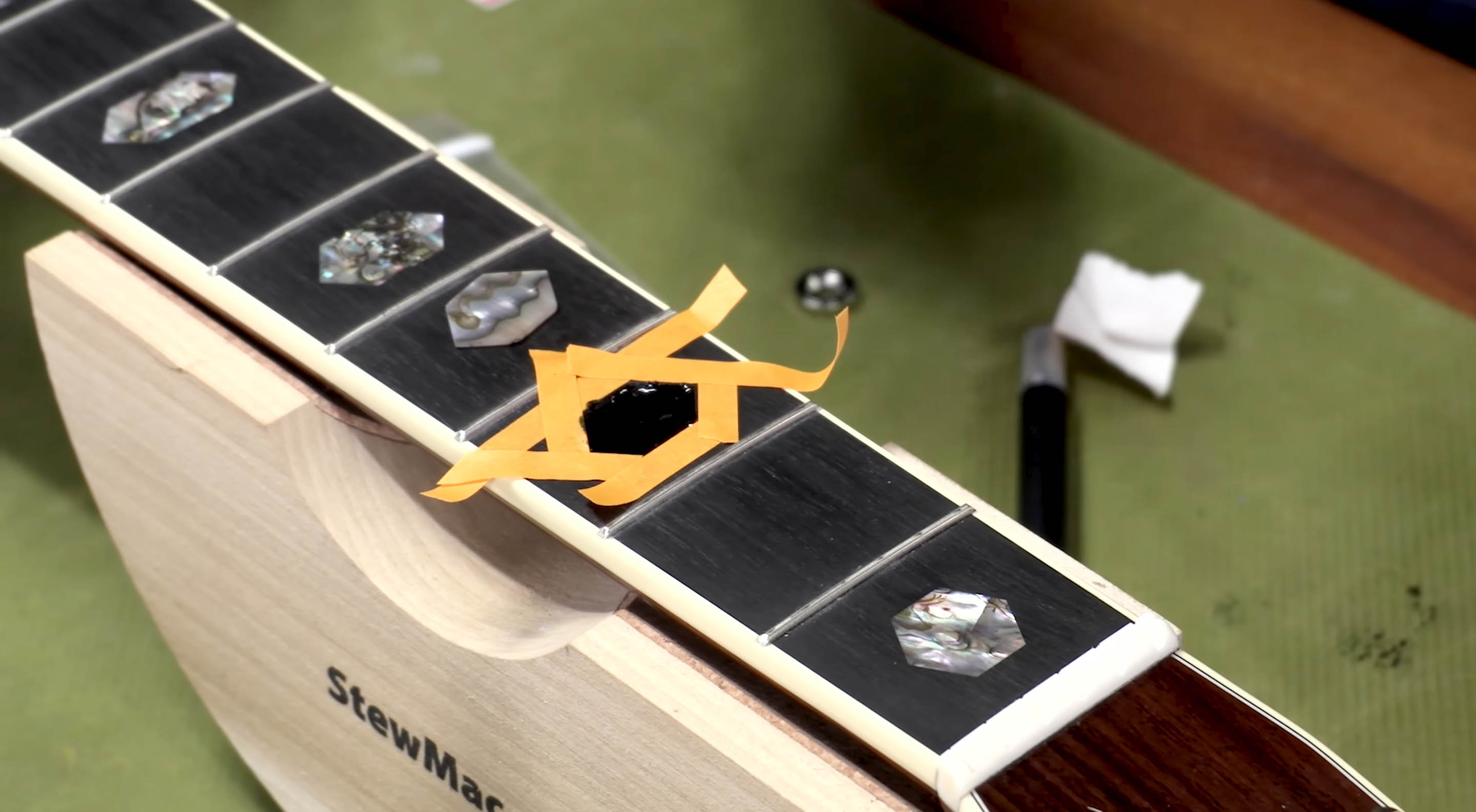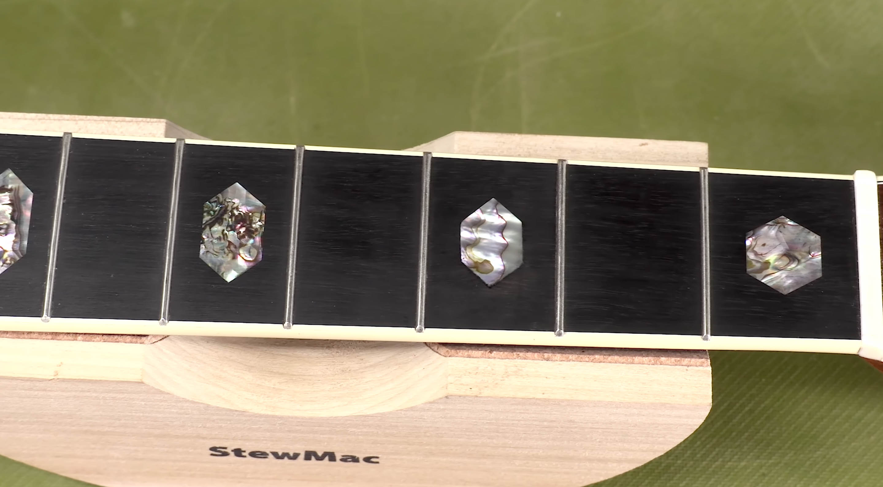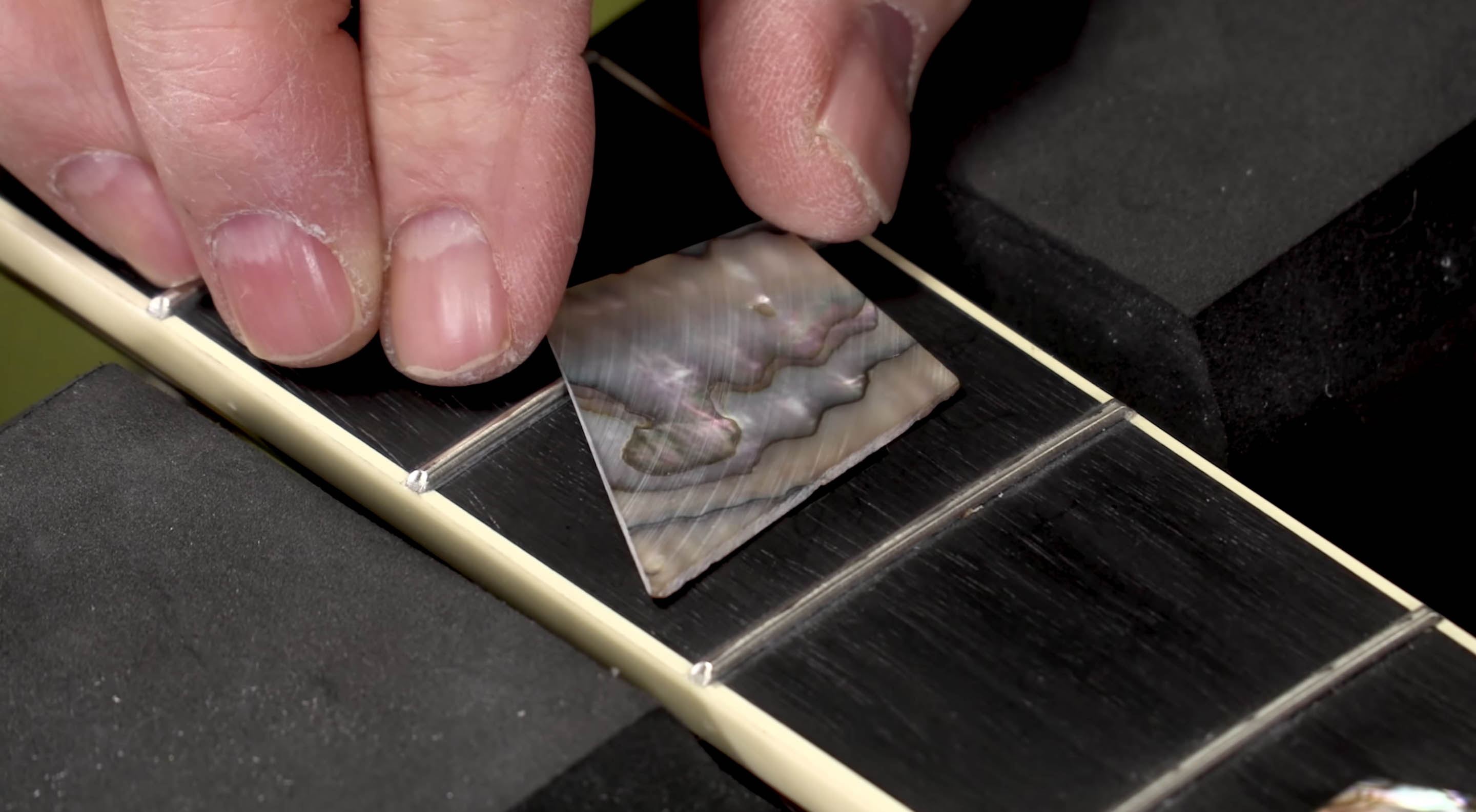 Abalam ist schön, mit ihm zu arbeiten, weil er perfekt flach ist. Echte Abalone-Platten können in der Dicke etwas variieren. Dieser Martin hier hat, für mein Auge, echte Abalone in allen Streifen, die um den Rand herum verlaufen, und auf dem eingelegten Martin-Logo auf dem Steckkopf. Auf der Fretboard sind einige dieser Inlays jedoch abalone und einige abalam. Bei StewMac verkaufen wir Pakete echter Abalone und wir verkaufen Blanks von Abalam.