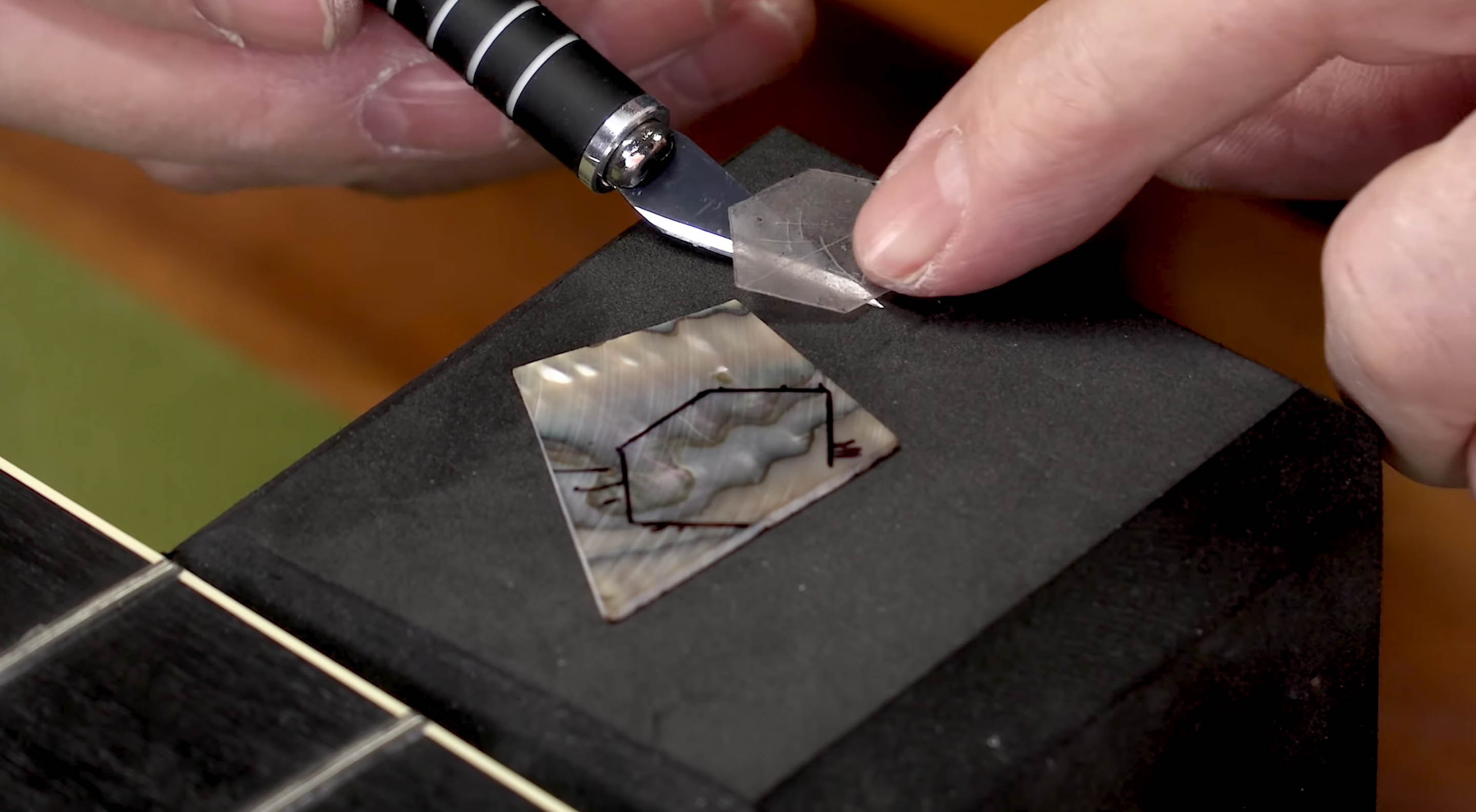 Ich möchte entscheiden, welcher Teil dieses Abalone-Teils dort am besten aussehen würde, und dann meine Vorlage verwenden, um sie zu verfolgen. Die Abalone hat diese kleinen Wellenlinien, die einem der anderen Inlay-Stücke ähnlich aussehen, und ich denke, das wird schön aussehen.