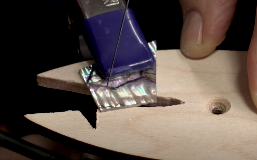 Es ist ein kleiner Jig, gegen den man Perlen schneiden kann. StewMac stellt eine Perlschneidevorrichtung her, an der Sie eine Luftpumpe anbringen und den Staub beim Schneiden leicht wegblasen können. Wenn Sie dies verwenden, sollten Sie unbedingt ein Atemschutzgerät tragen. Du willst keinen Perlenstaub atmen.