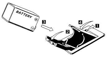 Verlegen Sie die Kabel des Batteriekastens und schieben Sie den schwenkbaren Batteriekasten wie in der Abbildung rechts gezeigt in Position. Die Stifte an der Schachtel rasten in die Löcher im Gehäuse ein. Die Drähte abschneiden und in den Steuerkreis der Gitarre einlöten. Installieren Sie eine 9-Volt-Batterie wie unten gezeigt.