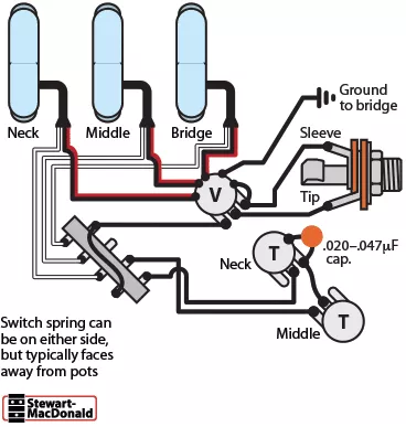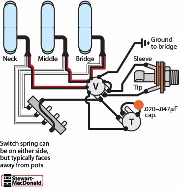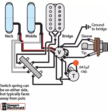 Mit CRL-5-Wege-Schalter. An Schalterposition 4 (Brücke/Mitte) wird der Humbucker spulengeschnitten.