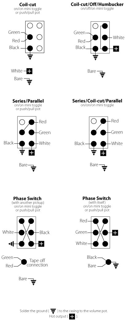Ein 4-Leiter-Humbucker verfügt über viele Verdrahtungs- und Tonoptionen. Bei Verwendung der folgenden Optionen wird der blanke oder Abschirmungsdraht auf dem Volumenbehältergehäuse „gelötet“.
