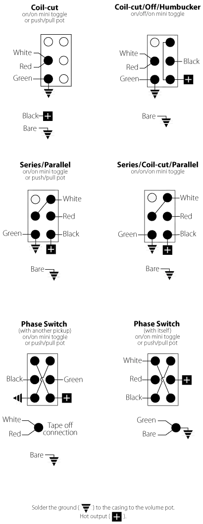 Ein 4-Leiter-Humbucker verfügt über viele Verdrahtungs- und Tonoptionen. Bei Verwendung der folgenden Optionen wird der blanke oder Abschirmungsdraht auf dem Volumenbehältergehäuse „gelötet“.