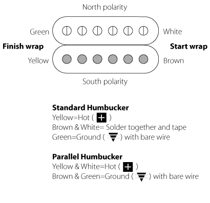 Schaltpläne und Farbcodes für Schaller Humbucking Pickups.