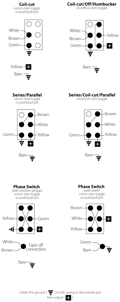Ein 4-Leiter-Humbucker verfügt über viele Verdrahtungs- und Tonoptionen. Bei Verwendung der folgenden Optionen wird der blanke oder Abschirmungsdraht auf dem Volumenbehältergehäuse „gelötet“.