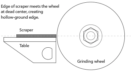 Bereiten Sie sich vor, um den Ultimate Scraper zu schärfen. Wenn der Schaber auf dem Tisch platziert ist, positionieren Sie den Tisch so, dass die Schleifscheibe auf die Kante des Schabers im Totpunkt trifft. Ziehen Sie die Befestigungsschraube fest, damit der Tisch fest sitzt.