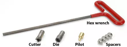 Gewindeschneidematrize Eine speziell entwickelte 10-32 -Matrize, die vorhandene Gewinde reinigt und neues Gewinde an der Stange schneidet. |