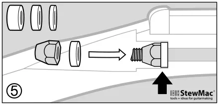 Schritt 5 Verwenden Sie einen Abstandshalter, um das letzte Stück Gewindestange abzudecken und eine Metalllagerfläche bereitzustellen. Verwenden Sie bei Kotflügelhälsen den 0,040" dicken Abstandhalter. Gibson-Gitarren benötigen im Allgemeinen einen 0,100 Zoll dicken Abstandshalter. In einigen Fällen wird der .200" dicke Abstandshalter benötigt.